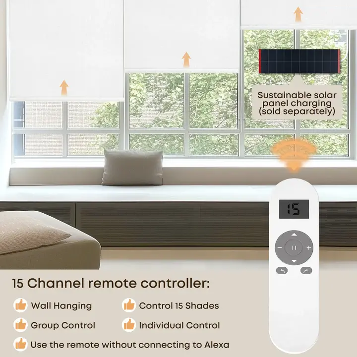 Intuitive Control: Manage multiple shades with a single remote. Adjust up to 15 shades individually or all at once, bringing seamless control to your fingertips.